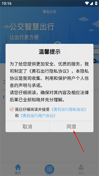 1、打开黄石公交软件,出现温馨提示弹窗后,勾选已阅读协议选项,点击同意按钮。