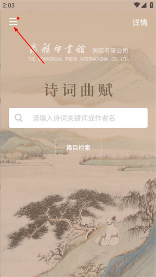 1、在唐诗鉴赏词典首页点击左上角菜单按钮,打开功能列表。