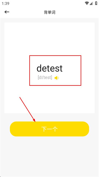 3、在背单词页面查看单词及发音,点击下一个继续学习后续单词。