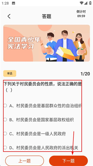 3、进入答题页面后,选择题目答案,点击下一题继续作答,直至完成所有题目。