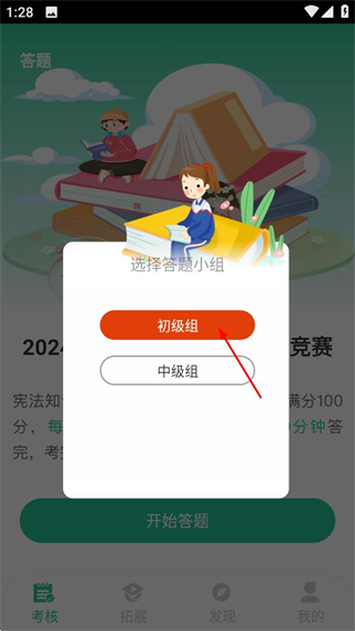 2、在弹出的小组选择框中,选择对应的答题小组如初级组。