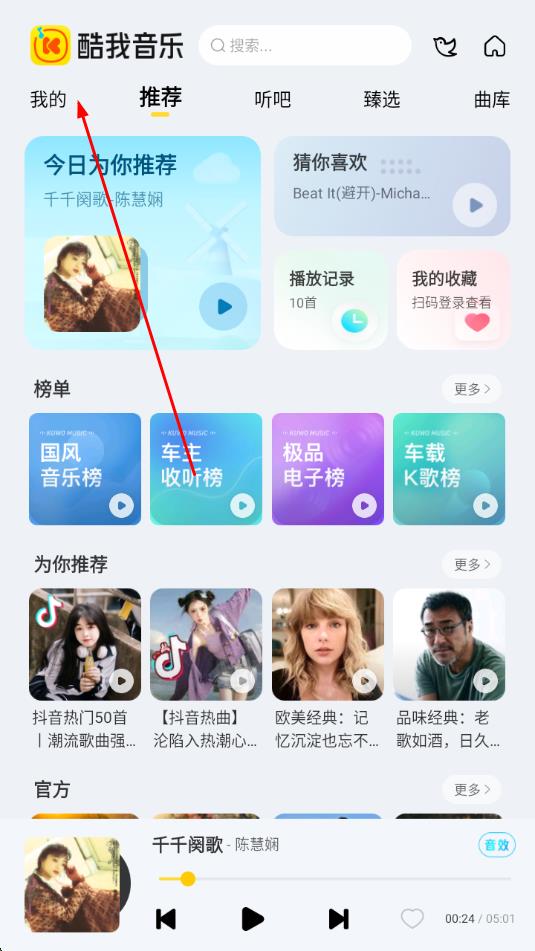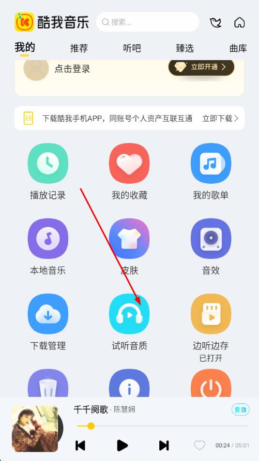 1、在酷我音乐主界面点击左上角我的标签,进入个人中心页面。