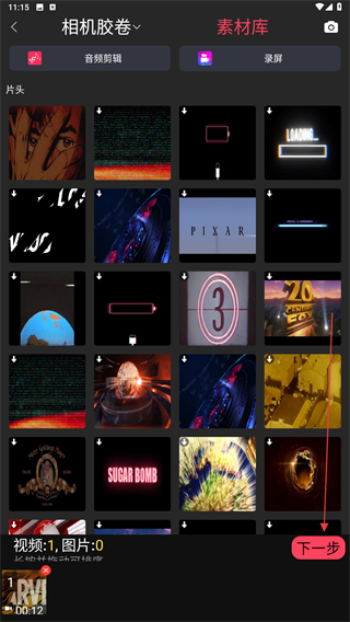 2、进入素材库的界面内,选择好素材后再点击下一步的按钮。