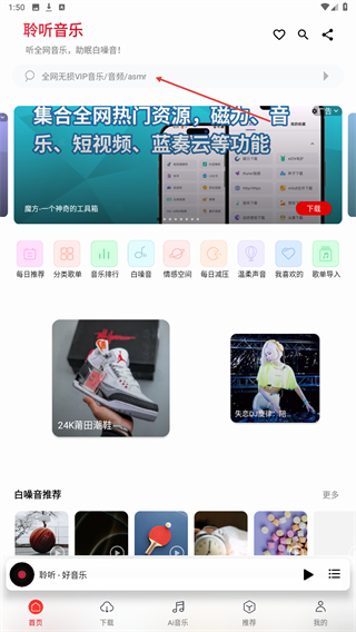 1、在聆听音乐主界面顶部找到搜索框,点击激活输入状态。