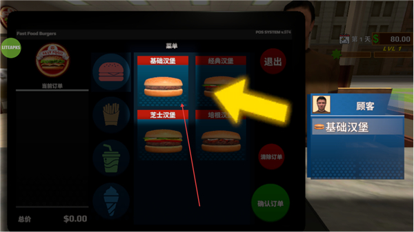 3、在菜单界面选择基础汉堡,确认订单内容,推进点餐流程。