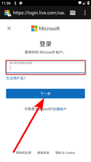3、在Microsoft登录页面的电子邮件或电话号码栏填写对应账号信息,点击下一步。
