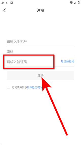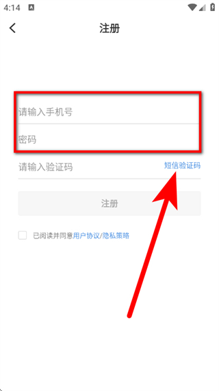4、在注册页面,输入手机号和设置密码,点击获取验证码。