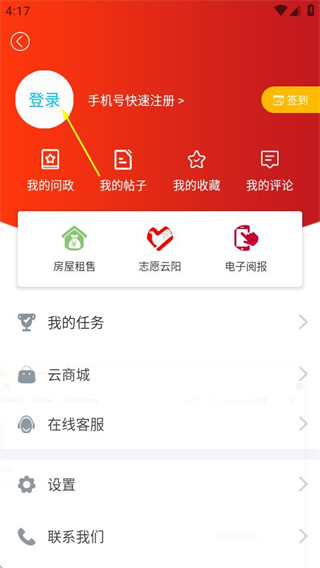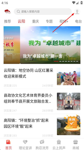 1、在理响云阳首页点击右上角头像图标,进入个人中心页面。