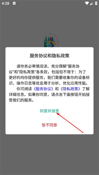 1、阅读服务协议和隐私政策后,点击同意并接受,进入应用。