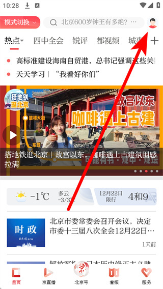 1、打开北京日报,点击首页右上角的个人头像图标,进入个人页面。