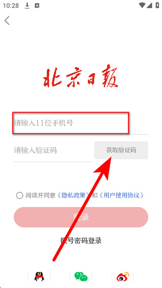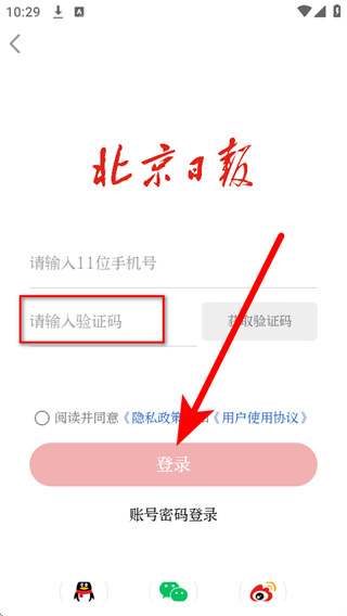 4、将收到的短信验证码填入框后,点击登录,即可完成北京日报的账号登录。