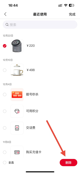4、勾选要删除的足迹记录,点击页面底部的删除按钮,即可完成足迹记录的删除操作。