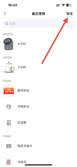 3、在最近使用页面,点击右上角的管理选项,进入足迹记录的选择操作状态。