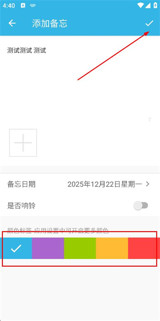 3、选择颜色标签后,点击右上角的对钩按钮保存该备忘录。