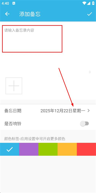 2、在添加备忘页面输入内容,可设置备忘日期等信息。