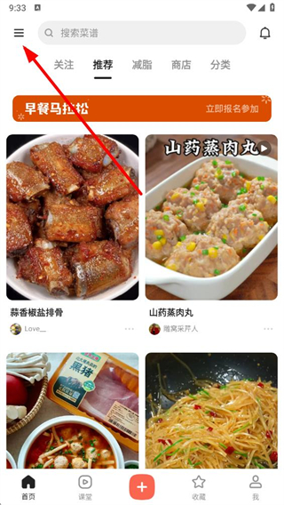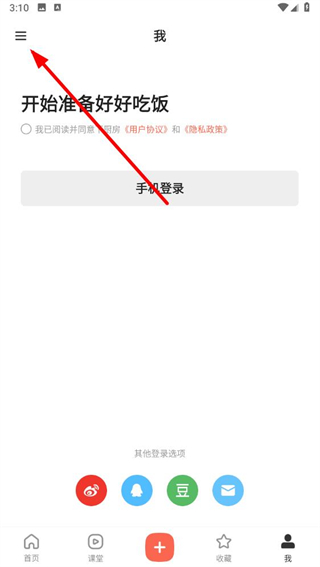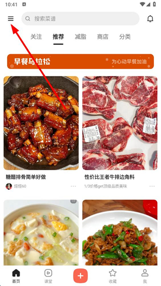 1、在下厨房app首页点击左上角的三条横线菜单图标,展开功能菜单。