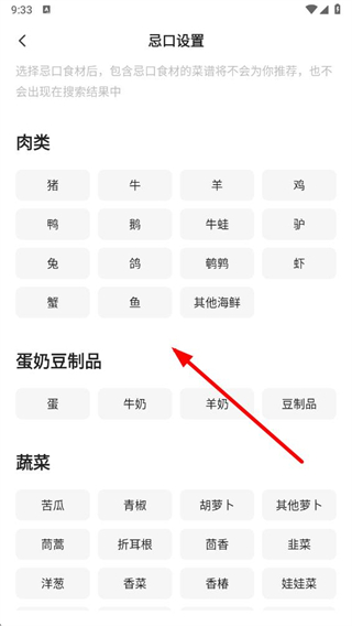 4、在忌口设置页面选择需要忌口的食物类别及具体食材,即可完成忌口食物设置。