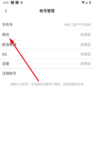 4、在帐号管理页面,点击微信选项,按照提示完成微信绑定操作。