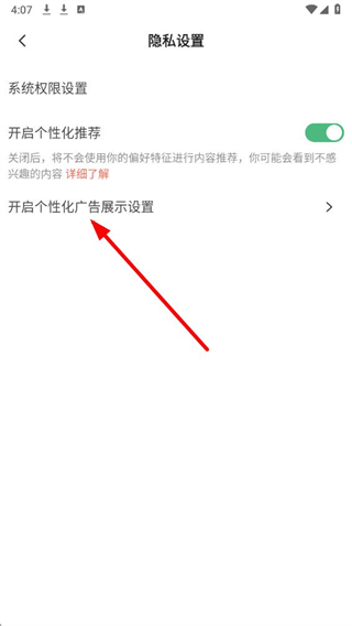 4、在隐私设置页面,找到开启个性化广告展示设置并点击进入。
