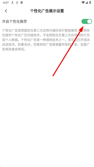 5、在对应页面,点击开启个性化推荐的开关按钮,将其切换为关闭状态即可完成操作。