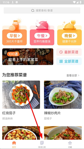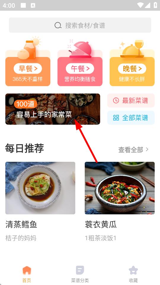 1、打开家常菜做法大全app,在首页点击100道容易上手的家常菜区域。