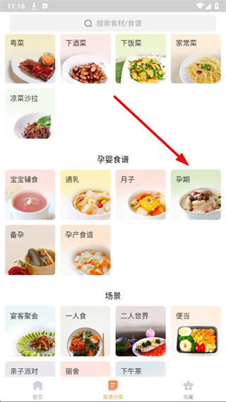 2、在菜谱分类页面中,找到孕婴食谱板块,点击孕期分类。