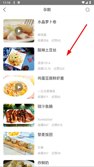 3、进入孕期菜谱列表后,选择心仪的菜谱,即可查看具体做法。