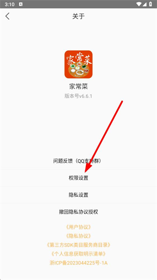 3、在关于界面里,找到权限设置选项并点击,进入权限相关的设置操作界面。