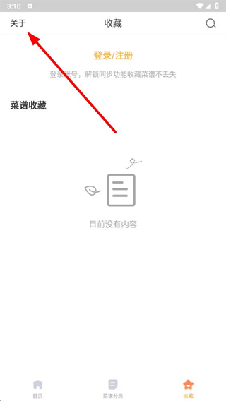 2、在收藏页面中,找到左上角的关于选项并点击,进入对应的关于操作界面。