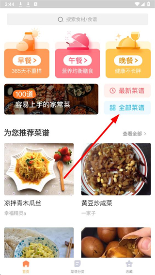 1、在家常菜app应用首页,找到全部菜谱选项并点击,进入菜谱分类界面。