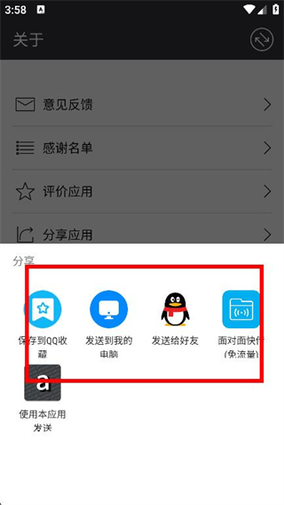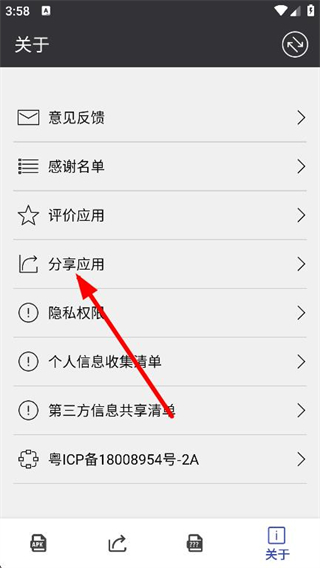 2、进入关于页面后,找到并点击下方的分享应用选项。