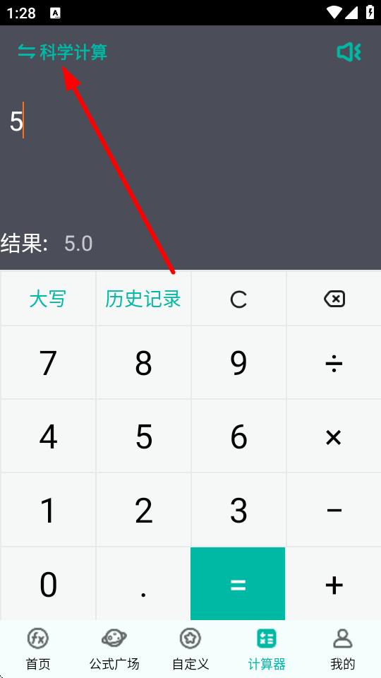 2、进入计算器界面后,点击左上角的科学计算,切换到科学计算模式。