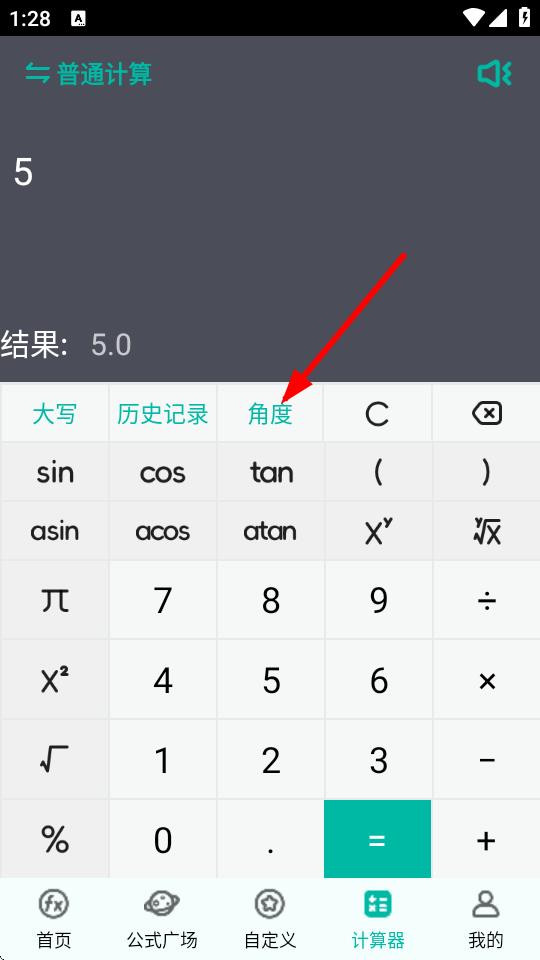 3、在科学计算模式下,点击角度选项,调出角度相关计算功能。