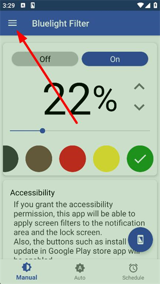 1、打开蓝光过滤器app,点击页面左上角的菜单按钮。