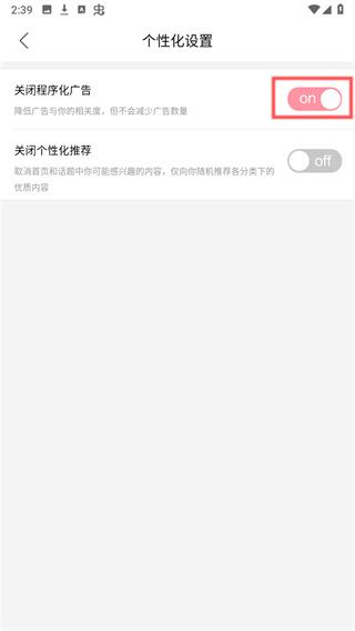 4、在个性化设置中勾选关闭程序化广告,降低广告与你的相关度。