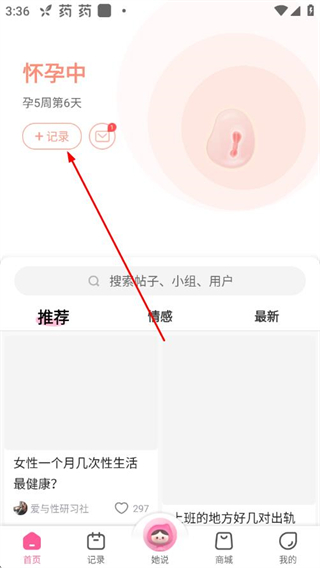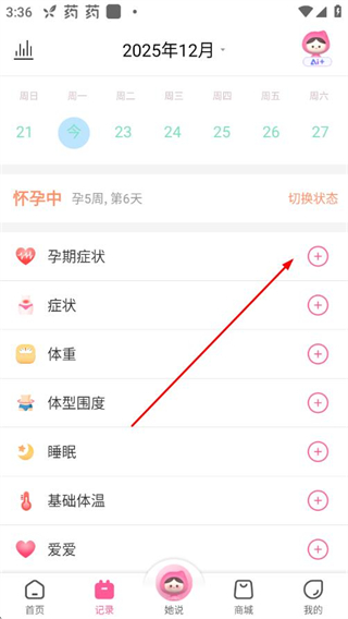 2、进入记录页面后,找到孕期症状并点击右侧的+。