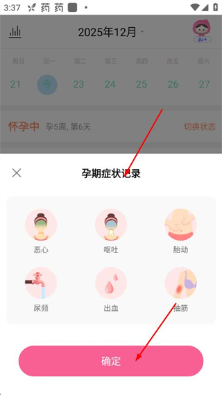 3、在孕期症状记录弹窗中选择对应症状,点击确定。