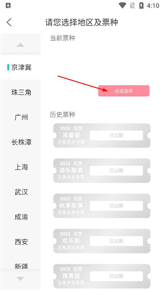 4、在京津冀票种页面找到点击选择按钮,完成对应票种的选择操作以便后续使用。
