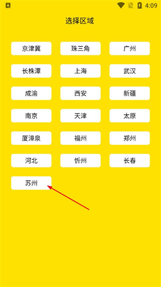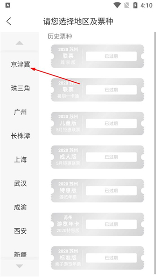 2、在选择区域页面找到苏州选项,点击该选项进入到对应区域的票种选择界面。