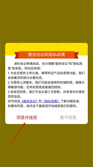 1、打开吉象多多年票应用,阅读服务协议和隐私政策内容,点击同意并接受按钮进入应用。