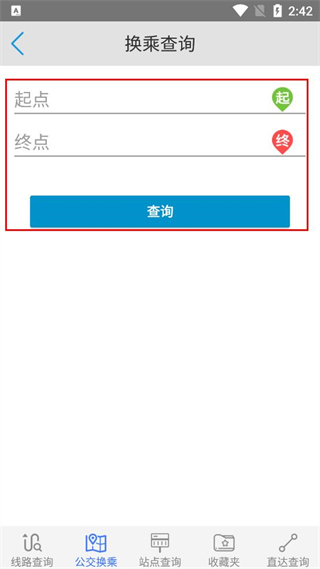 4、在换乘查询页面填写起点和终点信息,点击查询按钮获取对应的公交换乘方案。