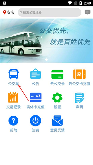 2、在主界面找到公交车选项,点击该选项进入到查询线路相关的操作页面。