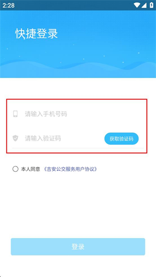 4、勾选本人同意吉安公交服务用户协议的选项,点击登录按钮完成登录操作。