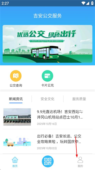 1、打开吉安公交服务应用,点击页面右下角的我的选项,进入到个人相关的页面。