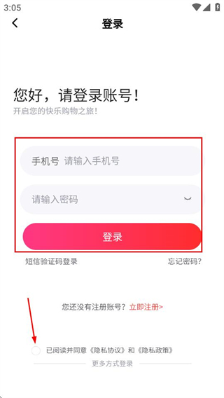 3、在登录页面填写手机号与密码,勾选协议后点击登录完成操作。