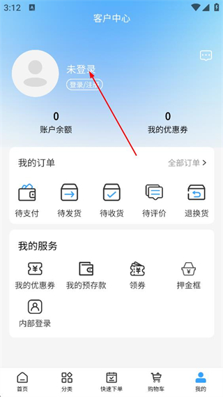 3、在客户中心页面,点击登录/注册区域,进入登录相关操作页面。