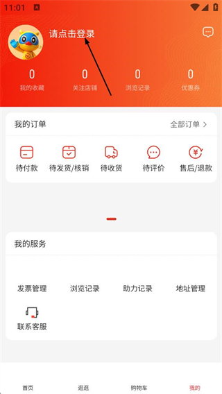 2、在我的页面,点击顶部的请点击登录区域,进入登录页面。