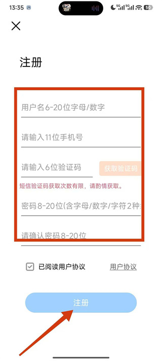 5、在注册页面,依次填写相关信息,勾选协议,点击注册完成账号注册。
