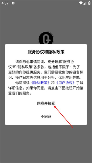 1、阅读服务协议和隐私政策后,点击同意并接受,进入应用。