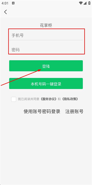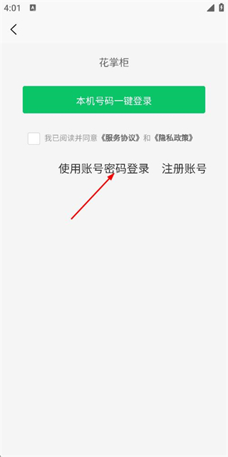 2、在花掌柜界面点击使用账号密码登录选项,切换到账号密码登录页面。